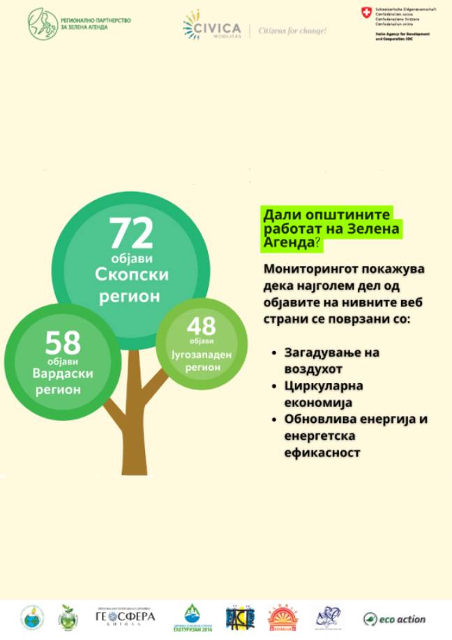 Мониторингот потврди дека имплементацијата на Зелената агенда на локално ниво се одвива нерамномерно меѓу регионите. Скопскиот регион е најактивен, додека Источниот и Североисточниот регион покажуваат најниско ниво на активност. Преовладувањето на соопштенија над суштински документи и одлуки укажува на потреба од засилување на имплементацијата на политики.